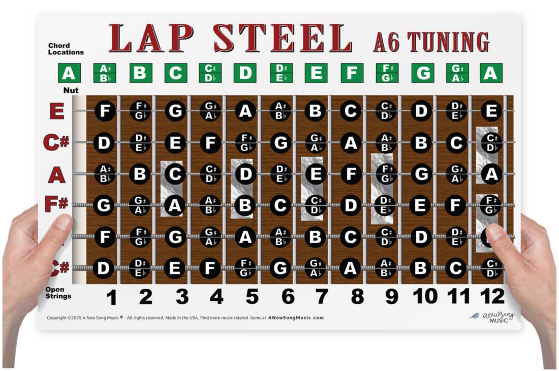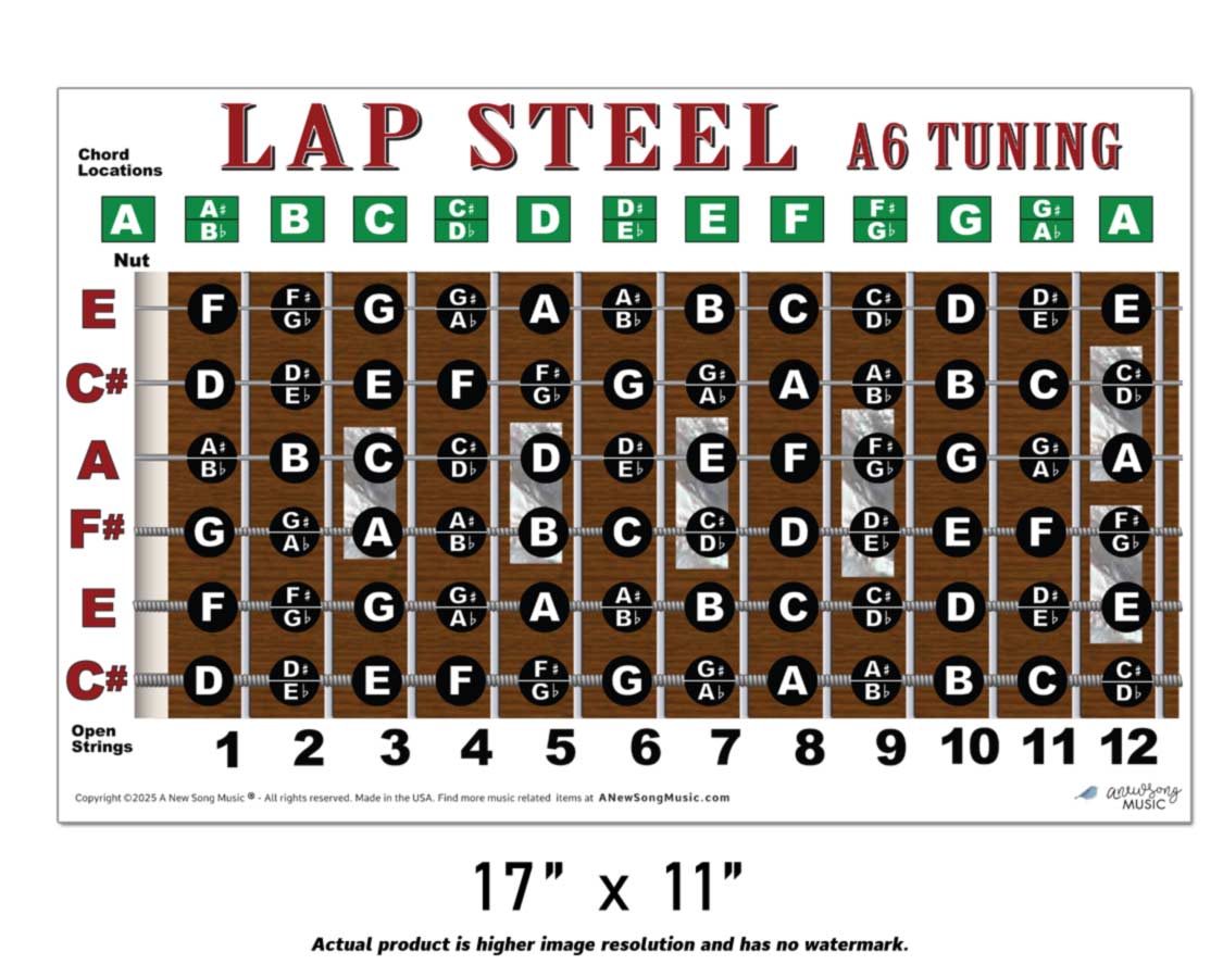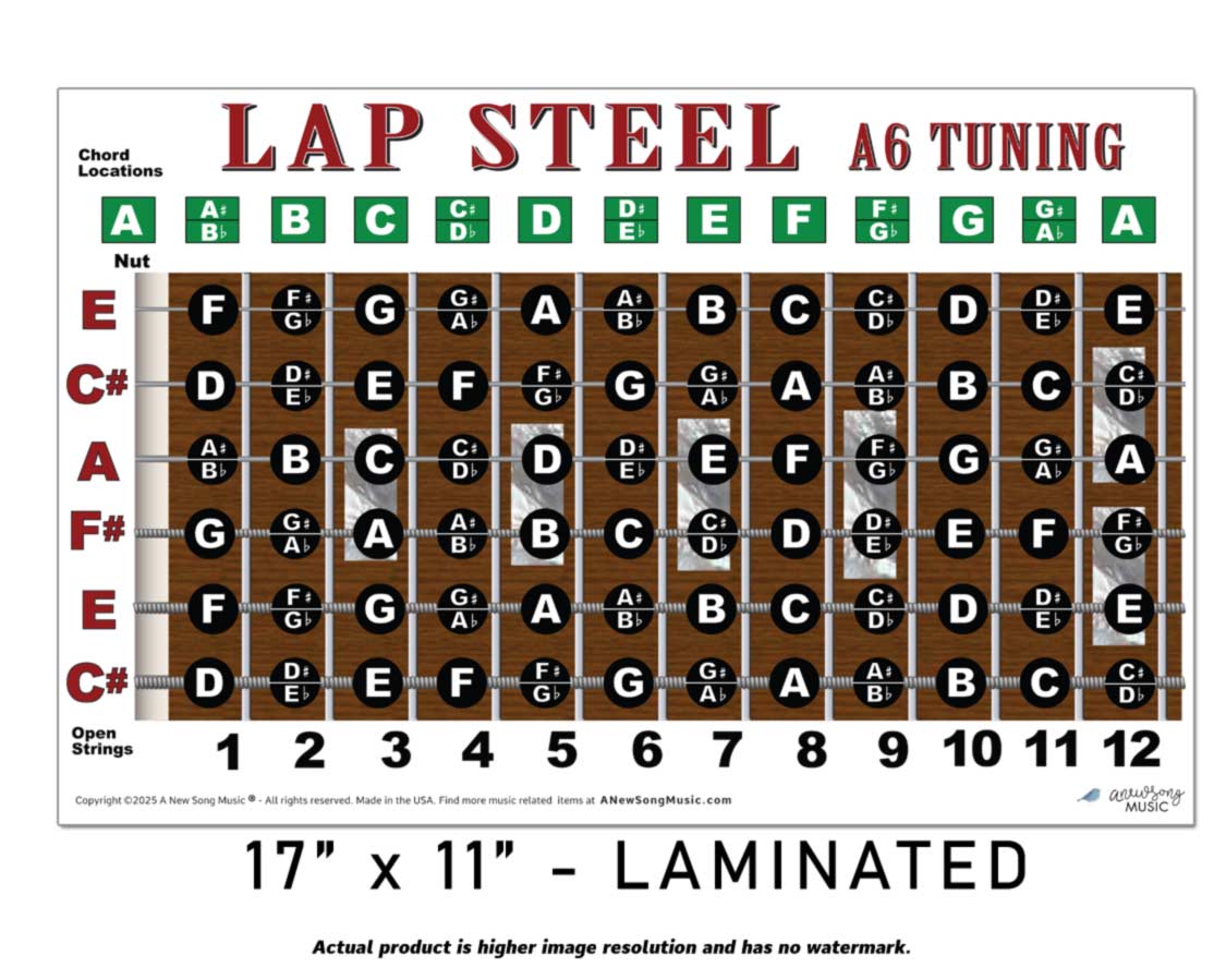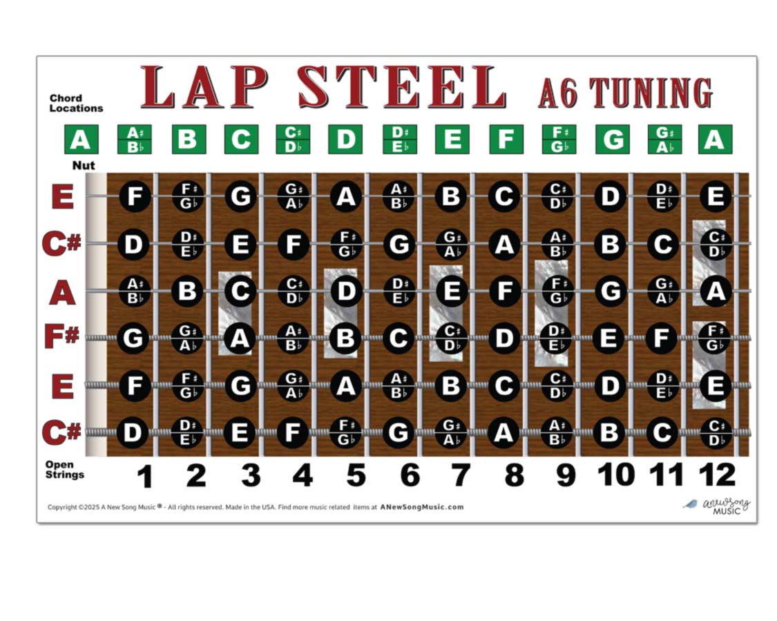 MASTER A6 TUNING: Finally master the essential A6 lap steel tuning (C♯–E–F♯–A–C♯–E) with this complete fretboard note chart. Visually map out every note across the neck to easily learn scales, understand intervals, and build chords with confidence.