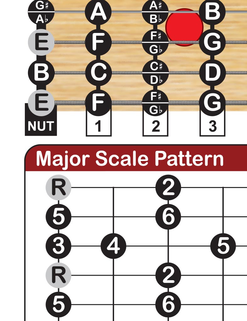 Map out your fretboard by writing the fret numbers (e.g., 2, 3, 4, 5...) at the bottom of the scale pattern to match your instrument's neck for the chosen key. You can also mark the fingerboard inlays (red circle, square, diamond, etc.) to help visualize neck position that you're working with.