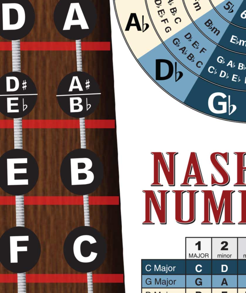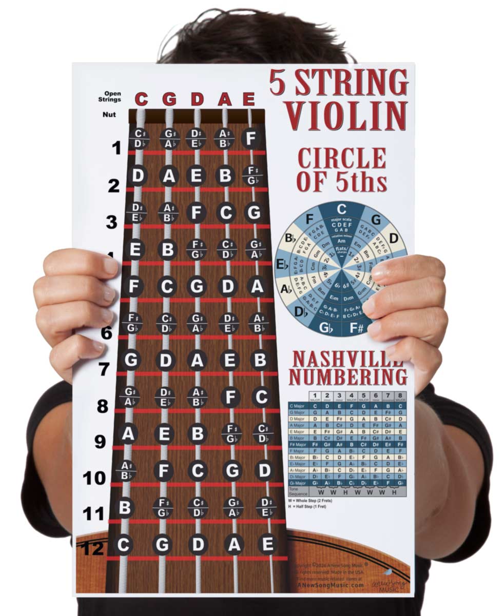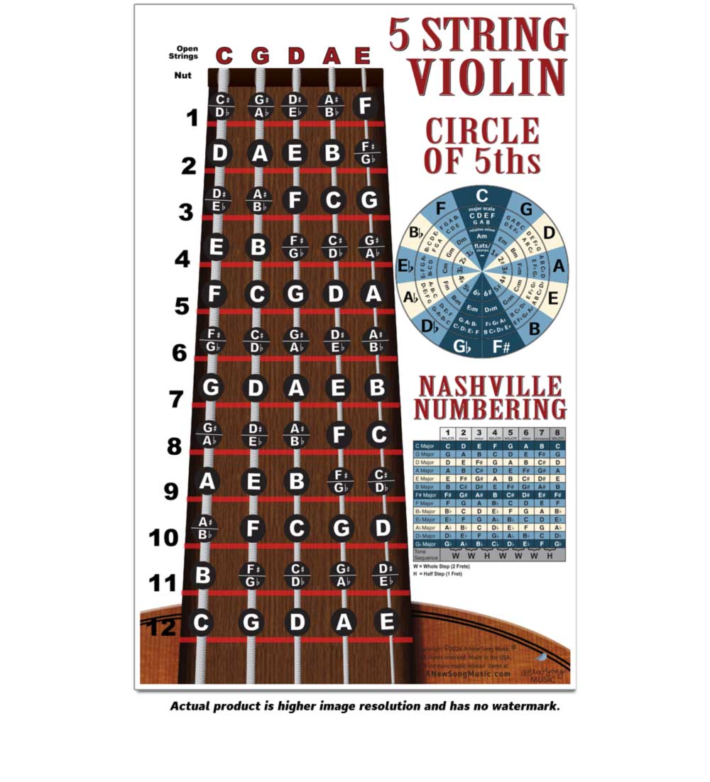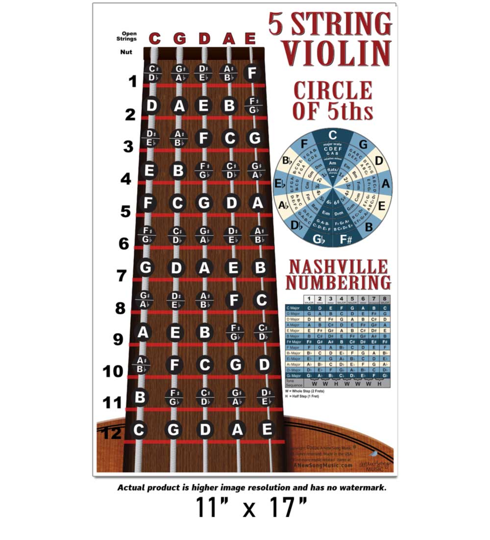 The 8.5" x 11" chart is great to put in your notebook or on the wall. The 11" x 17" poster is perfect to hang on the wall wherever you practice for easy reference, instead of flipping through a book. This chart displays the location of the notes on the fingerboard of a 5 String Violin / Viola. Also includes Circle of 5ths Diagram as well as Nashville Numbering Chart. This information can be found in books, but rarely on one easy to read chart!